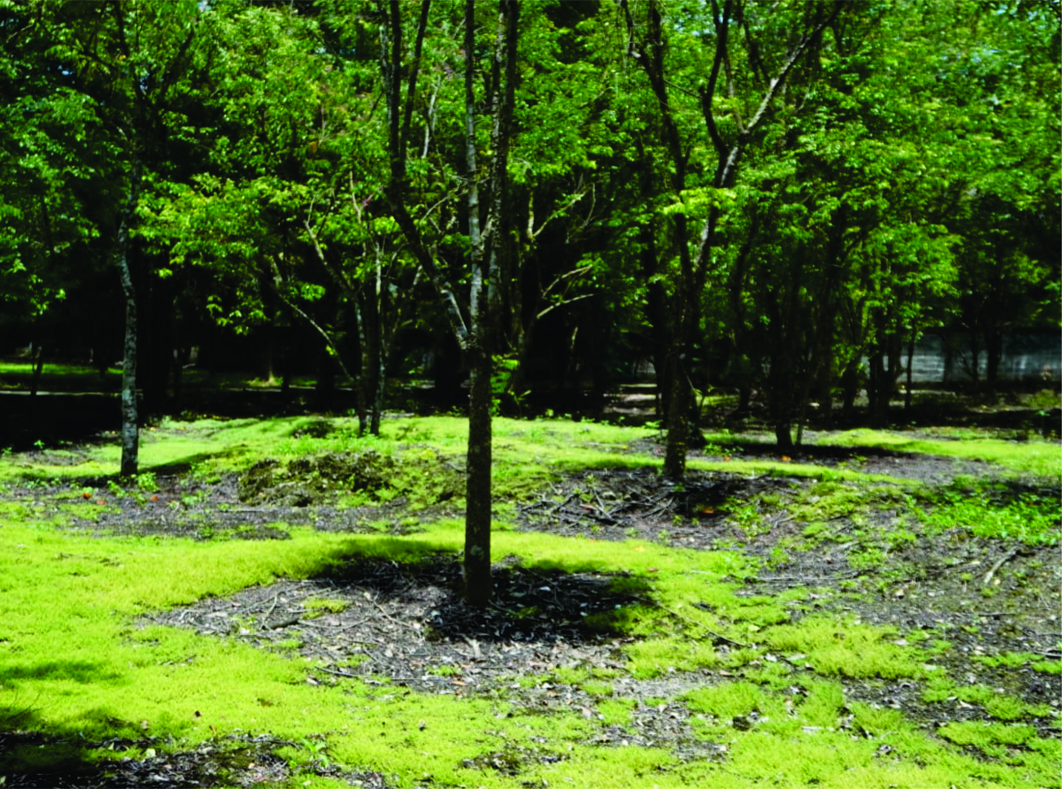 Pepohonan rindang, kolam air yang indah, serta elemen-elemen arsitektur